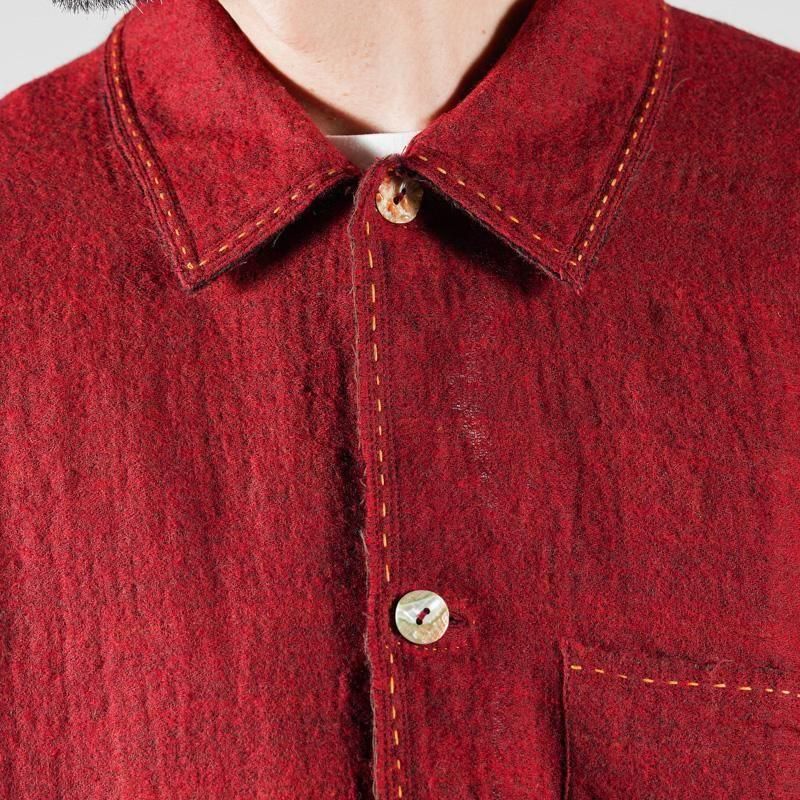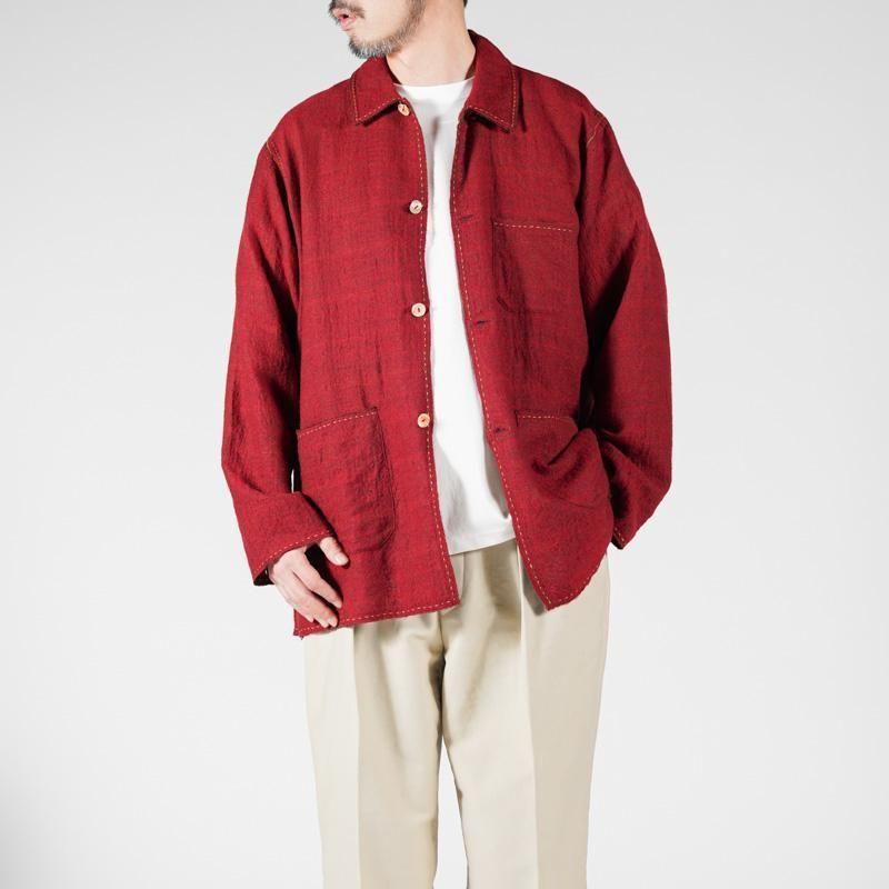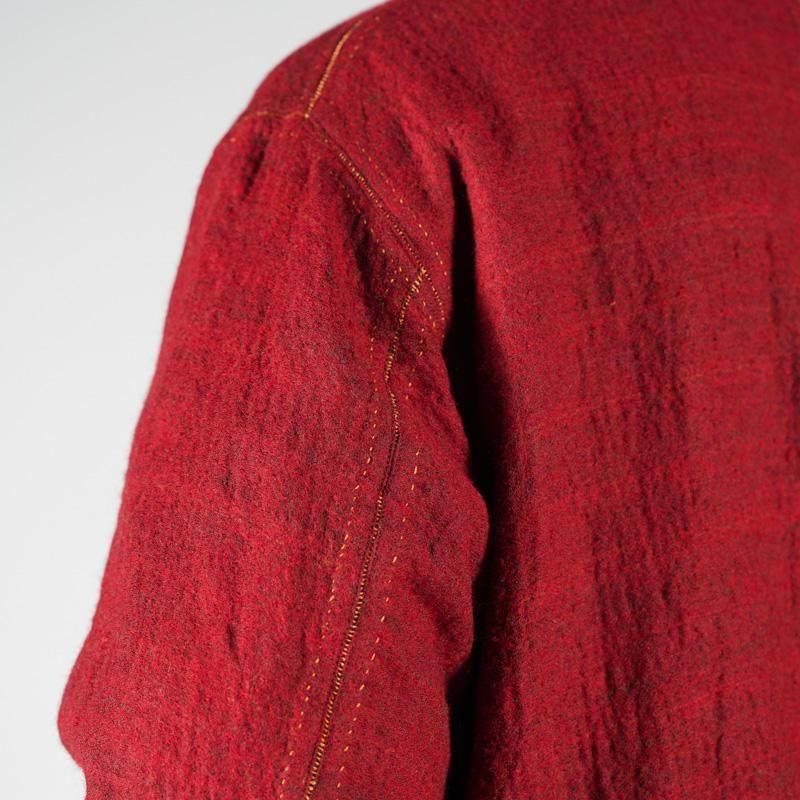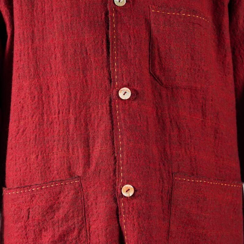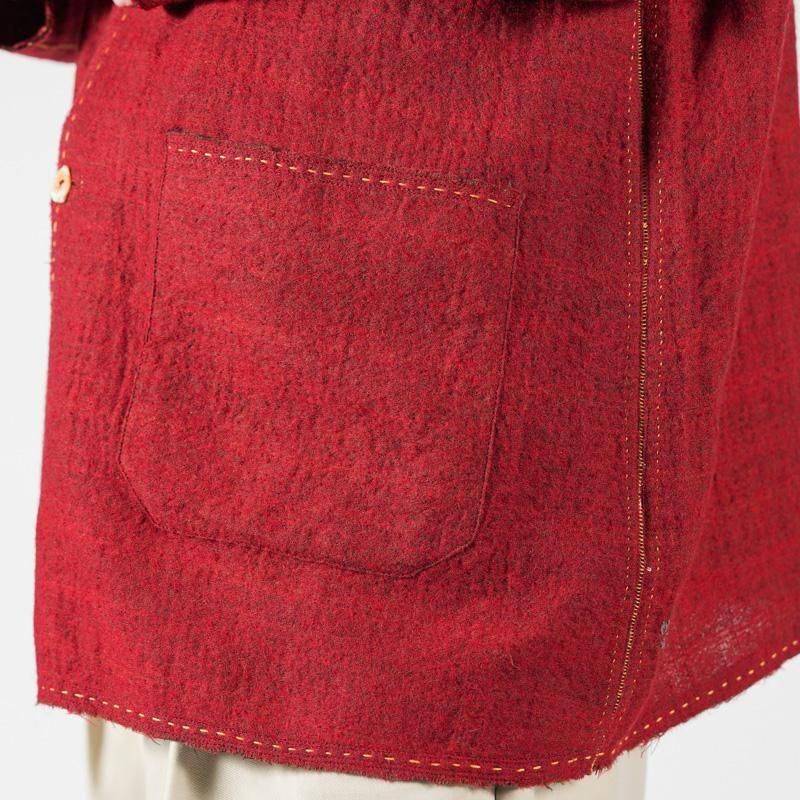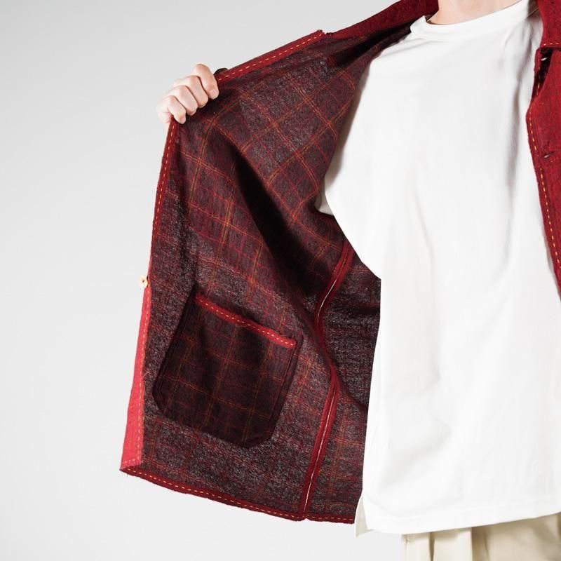 柄の異なる共地を貼り合せたWフェイスの縮絨ウール。特徴的なステッチやボタンなど、快適さだけではなく、ファッション性もしっかり兼ね備えています。