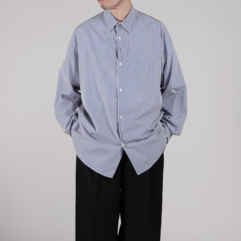 なめらかに整った繊維そのものの光沢感と、均一な撚りにより毛羽立ちにくい超長綿であるスーピマコットン。非常に繊細な糸番手で製織したブロード生地を使用。高級シーツにも使用されている生地で適度なハリと柔らかさがあり着心地が非常に良い。ドロップショルダーでボリュームのあるボックスシルエット。オーセンティックなレギュラーカラー。肩の傾斜や低く下げられたヨークの位置、アームホールの広さなど、細かなディテールを特異なバランスで仕上げたビッグシルエットが特徴。