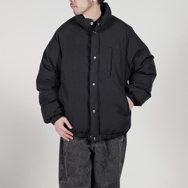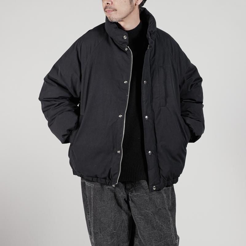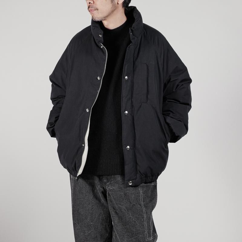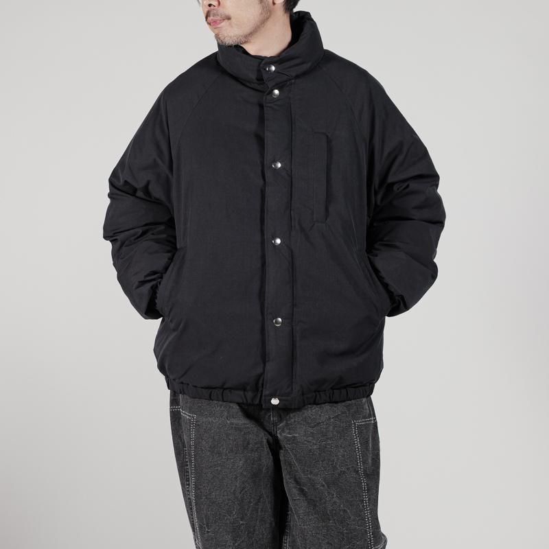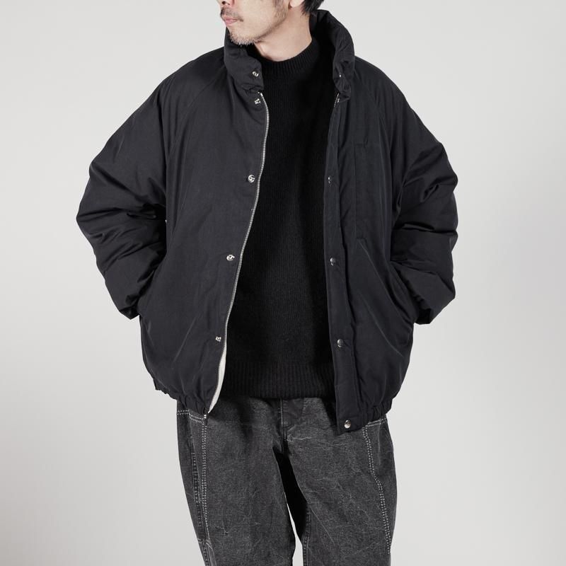 表地は経糸にギザコットンを、緯糸にシルクスパン糸を使用。経緯で僅かに濃度差をつけ、チーズ硫化で糸染めしヴィンテージ加工を施すことで、 色合いを保ちつつコシが抜けた上品かつソフトな生地の風合いと軽さが特徴。 裏地には綿カス残しのシーチング生地を使用。中綿はブルガリア産ホワイトダックダウン ( ダウン 90%、フェザー 10%)。ファスナーはriri ドットボタンはFIOCCHI。