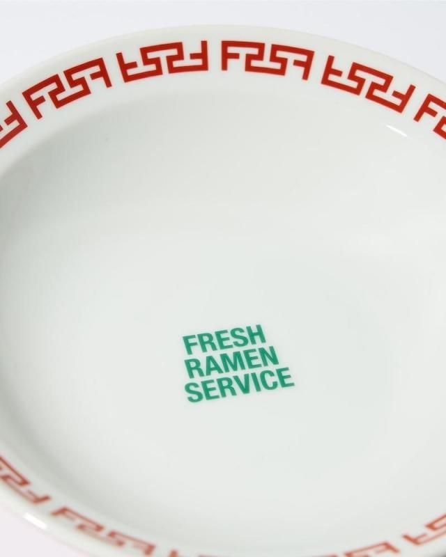 クラシックな雷文を縁に配した、美濃焼の浅型スモールボウル。手作業で仕上げられているため、釉薬のムラや刷毛跡、色合いの個体差が一点一点に異なる表情をもたらし、器としての味わいを深めます。内側には「FRESH RAMEN SERVICE」のロゴがあしらわれ、懐かしさとユニークさが共存する佇まいに。コンパクトなサイズ感と安定感のある高台が特徴です。