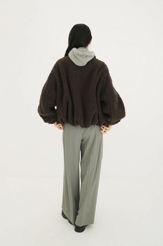 暖かく保温性に優れたウール混素材を使用し、大粒のボアでボリューム感がありながらも軽やかに仕上げました。自然な光沢と滑らかな毛並みが、高級感のある印象を引き立てます。