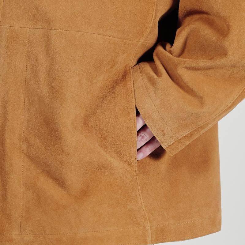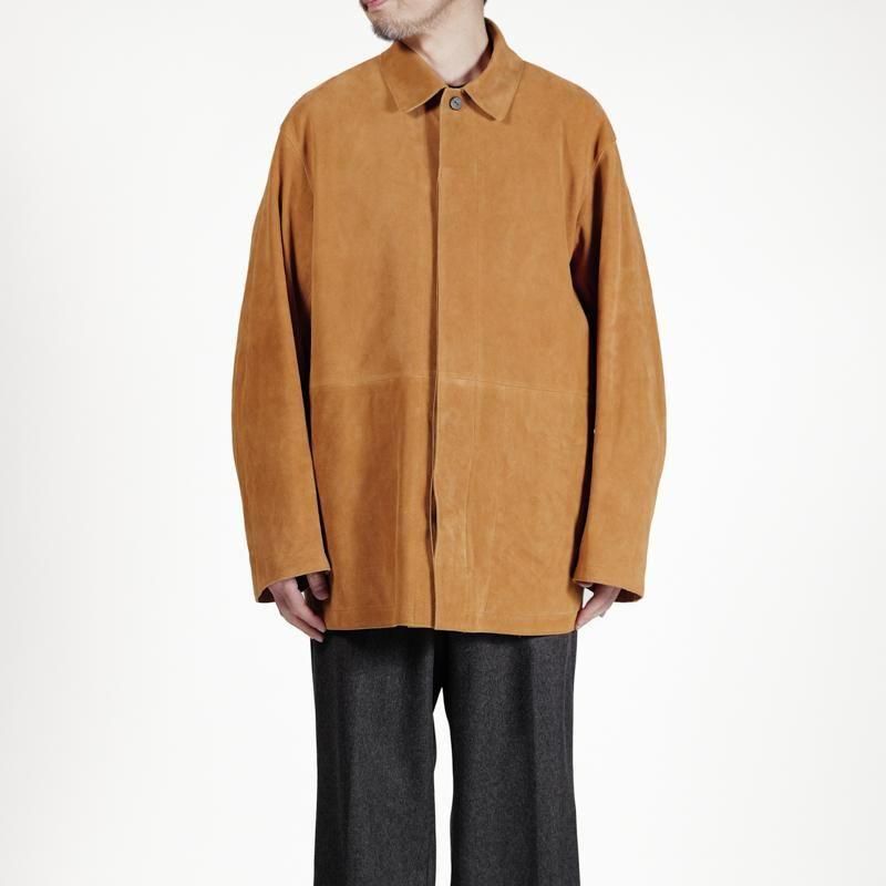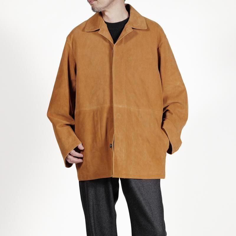 上質なゴートスエードを使用したジャケット。直に伝わる革のしっとりとした質感、滑らかな質感としっとりとした触り心地が特徴です。ゆとりのある身幅にドロップショルダー、太長いアームホールから、HERILLらしさの残るサイジング。従来の堅苦しいレザージャケットとは一線を画す着用感は、”気張らず” 着れて心地良さも抜群です。